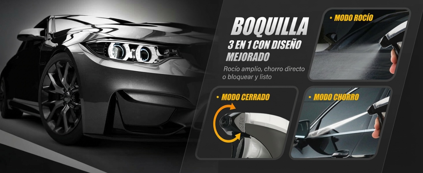 Actualiza a nuestra boquilla 3 en 1 para un cuidado del auto sin esfuerzo. Cambia entre los modos de apagado, rocío y chorro directo. Una botella, control total: más limpio, más rápido y más simple.