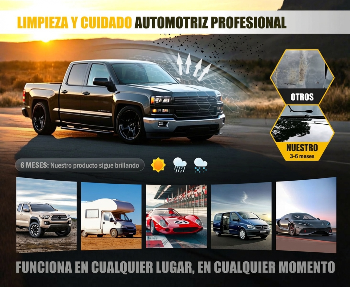 Protege tu auto de la lluvia ácida, los rayos UV, insectos, excremento de aves y otras suciedades con una capa duradera de polímero de sílice-nano que dura más de 6 meses. Resistente a la intemperie y a los lavados, mantiene la pintura de cualquier auto brillante y protegida. Funciona en todos los colores, acabados y tipos de vehículos.